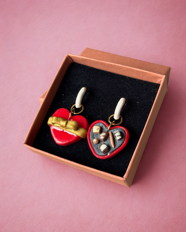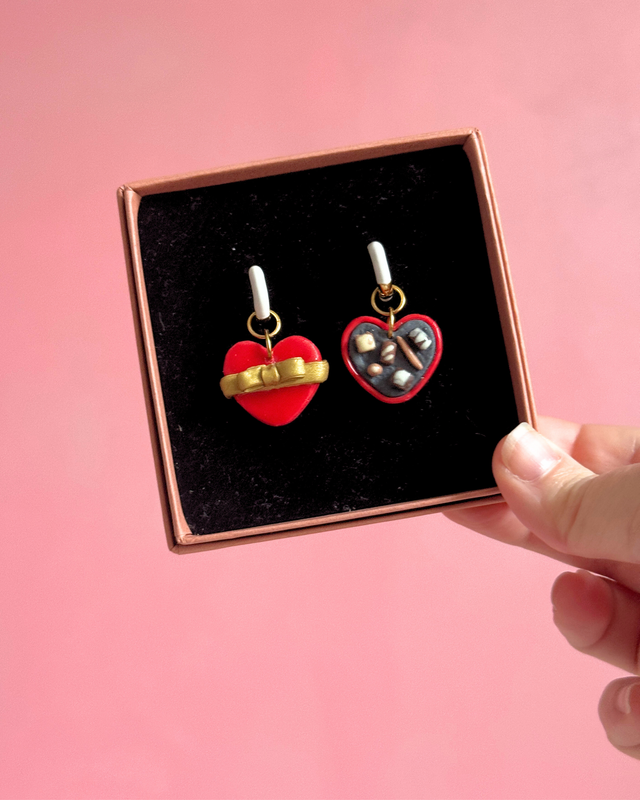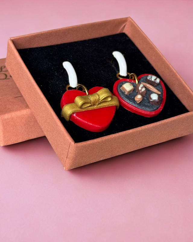 Les charms Boîte de chocolats en forme de cœur rouge, ornés d’un nœud doré et pensés comme de petites boîtes qui s’ouvrent, célèbrent l’amour et la gourmandise 🍫❤️